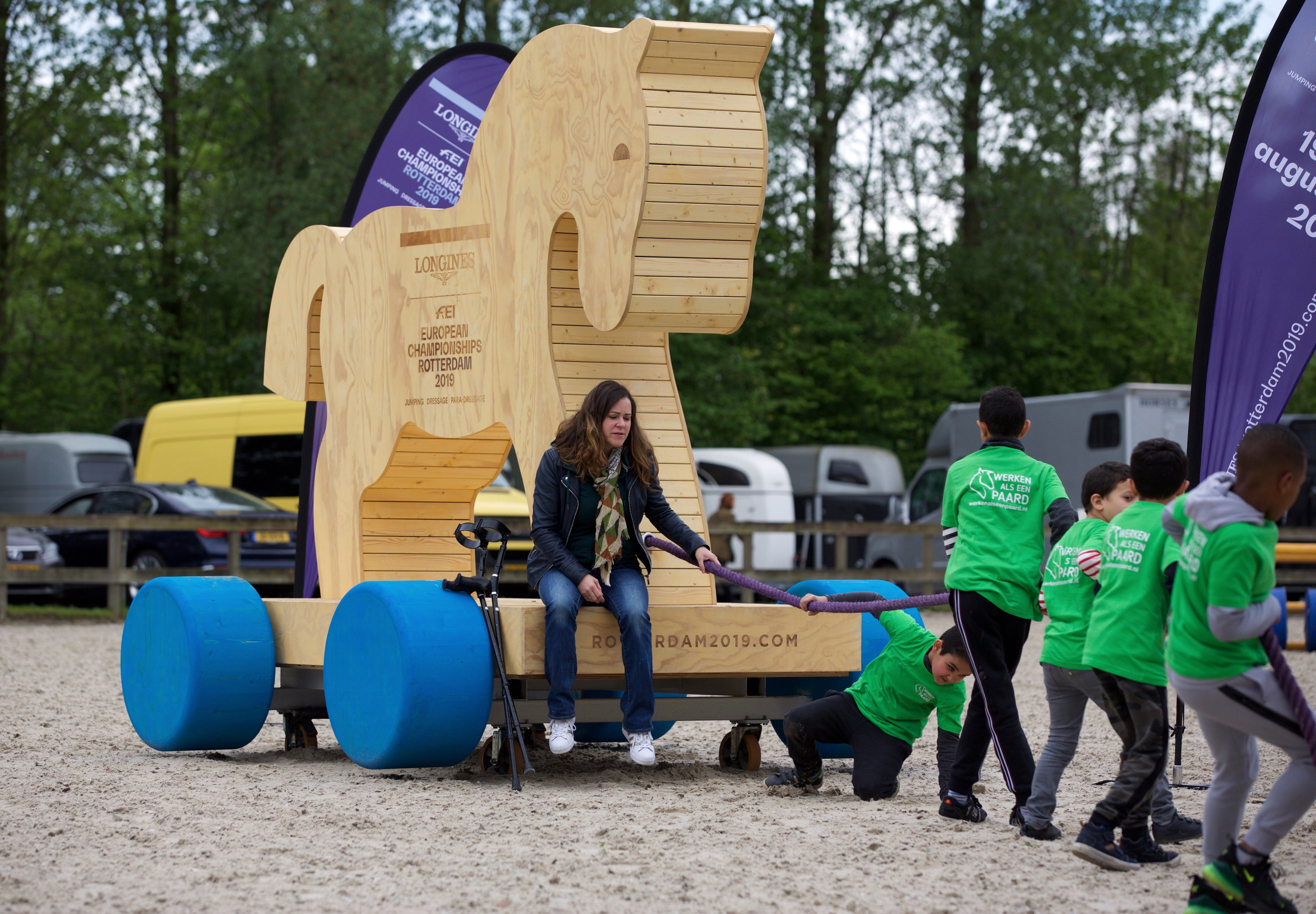 Vandaag hadden de leerlingen van OBS Pantarijn, binnen het project Werken als een Paard Vakantieschool, de primeur om op het terrein van de Rotterdamsche Manège kennis te maken met Tebbie. Ook mochten zij het EK-parcours springen met echte hindernissen, dat vanwege de aankomende EK's speciaal voor kinderen van Rotterdamse basisscholen is gemaakt. Rotterdam Topsport, Sportbedrijf Rotterdam en Rotterdam Festivals zorgen samen dat Rotterdam als Host City van de EK's prominent op de kaart komt te staan, zowel voor de Rotterdammers als voor de bezoekers van de Longines FEI Europese Kampioenschappen Springen, Dressuur en Para-Dressuur 2019.